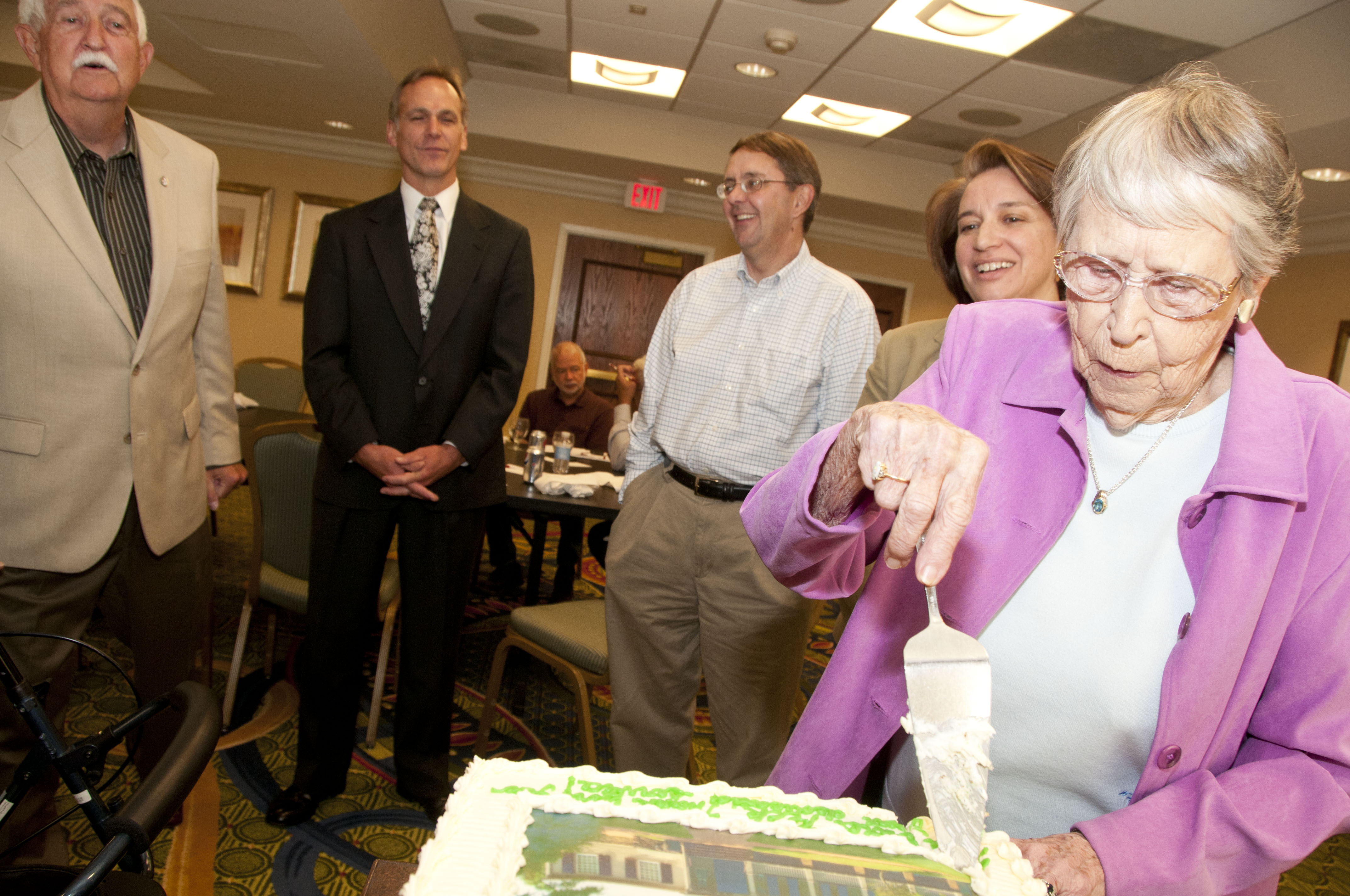 Former Sully Historic Site Manager and Sully Foundation Board member Margaret Peck cuts the cake at her retirement party. Behind her from left to right are Hal Strickland, Sully District representative, Park Authority Board; Park Authority Director John Dargle, Jr.; Sully District Supervisor Michael Frey; and Sully Historic Site Manager Carol McDonnell.