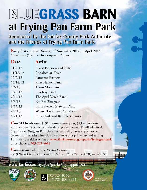 The Bluegrass Barn Series is sponsored by the Fairfax County Park Authority and the Friends of Frying Pan Farm Park. Bluegrass Barn concerts can be heard on the first and third Sundays from November through April. Doors open at 6 p.m. Concerts start at 7 p.m. Tickets are $12 in advance; $15 at the door. Season passes, which include admission to all shows and offer prime, reserved seating, are available for $132. Purchase tickets online, or call 703-222-4664. For more information, call 703-437-9101.