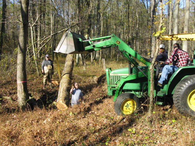 A tractor moves heavy logs into place.