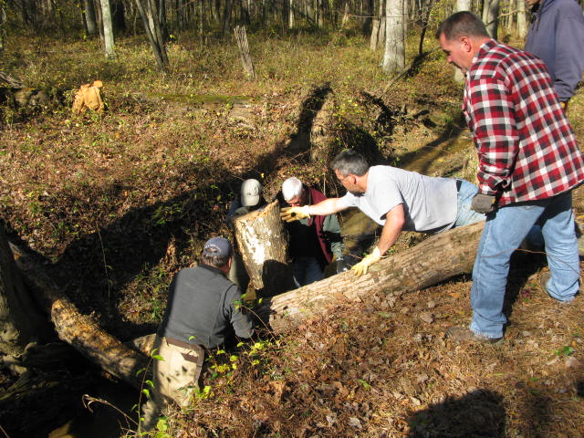 The team places logs in the stream by hand.