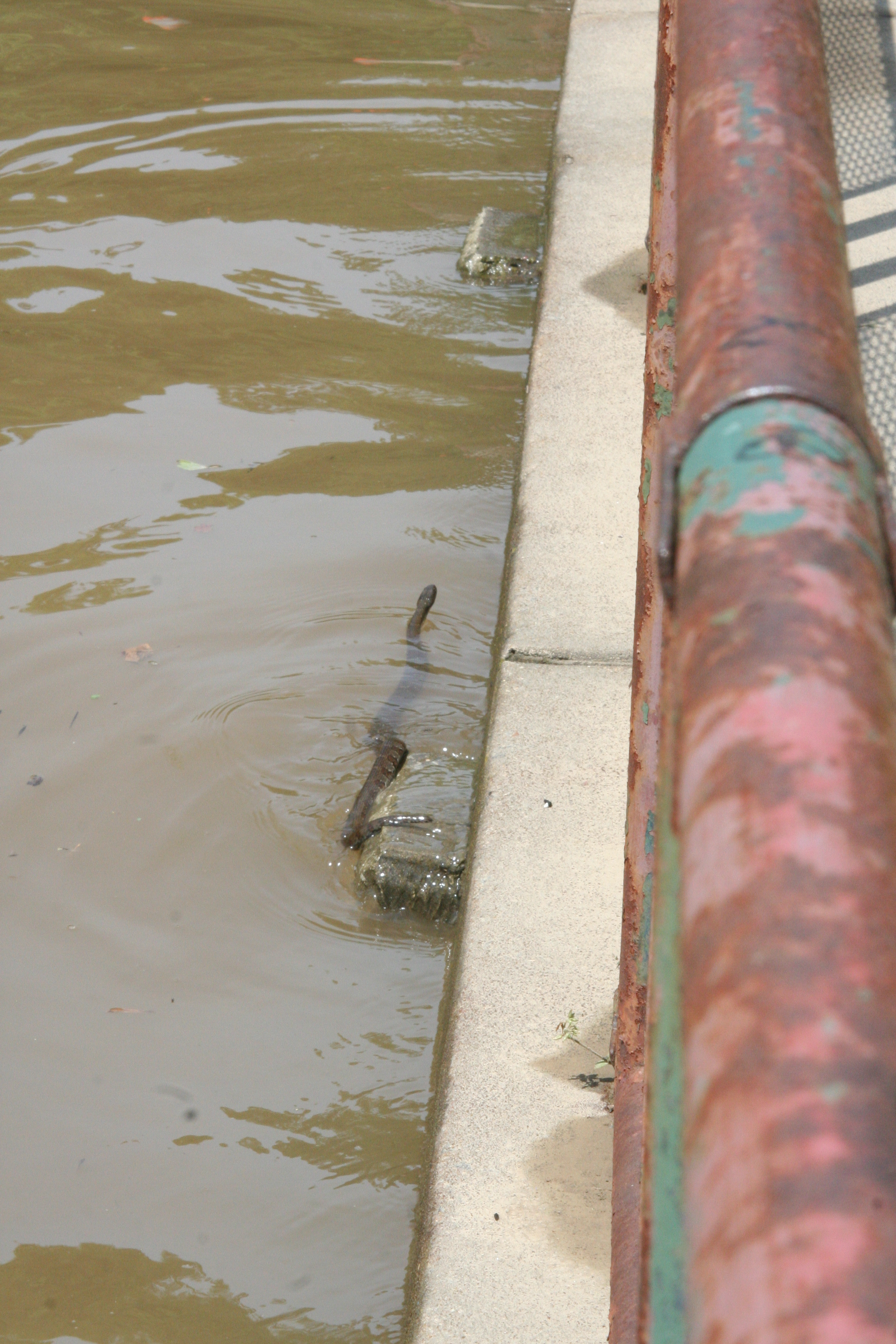 This Northern Water Snake looks for a safe place away from curious school children and rising waters.