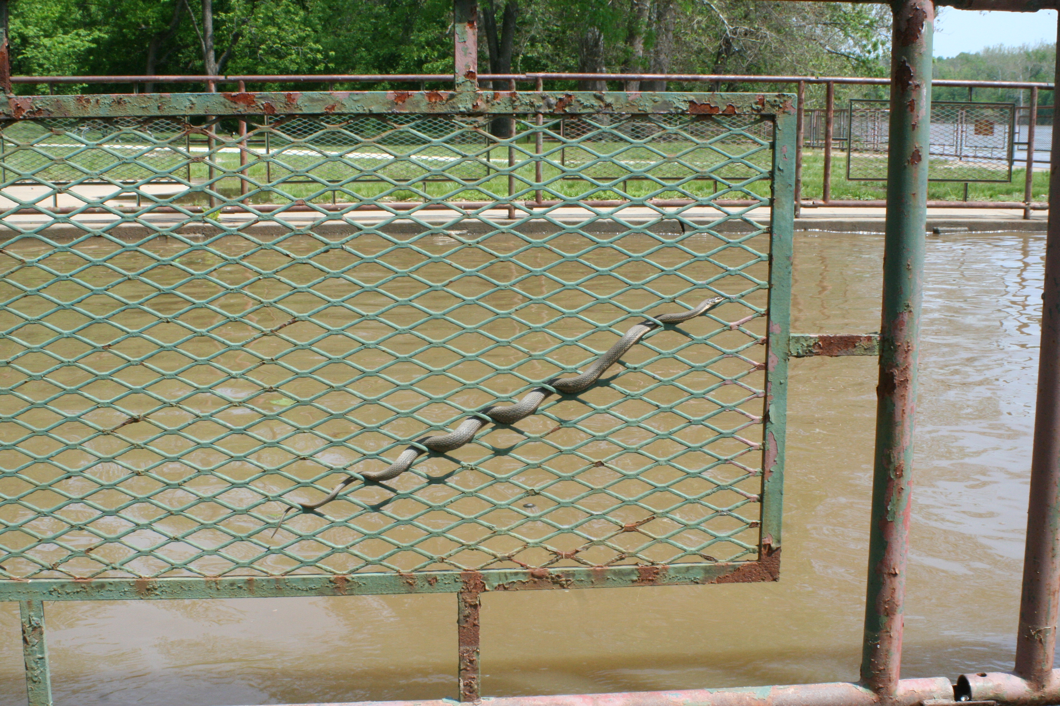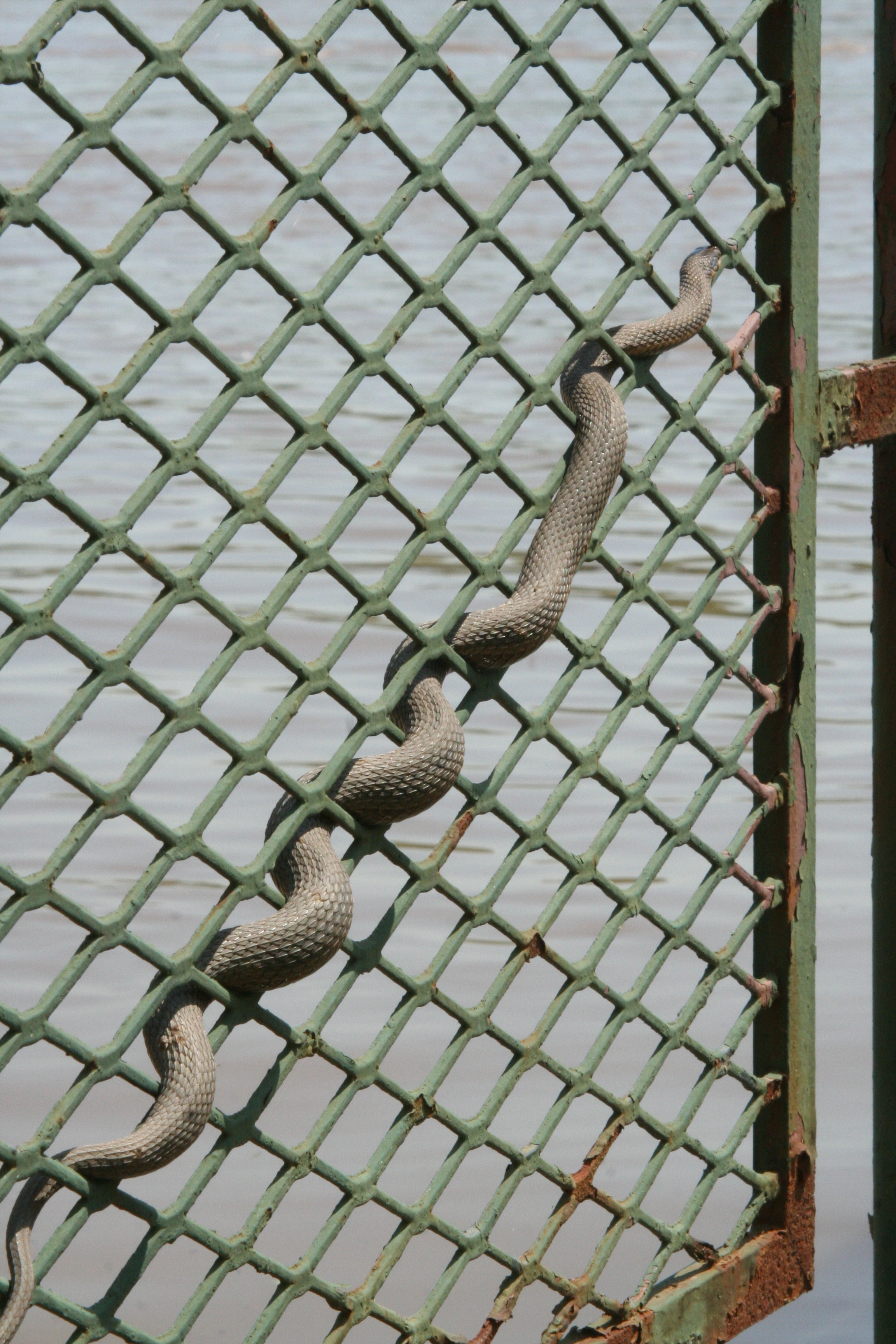 This Northern Water Snake hangs out on the bottom railing of the walkway as water levels rise.