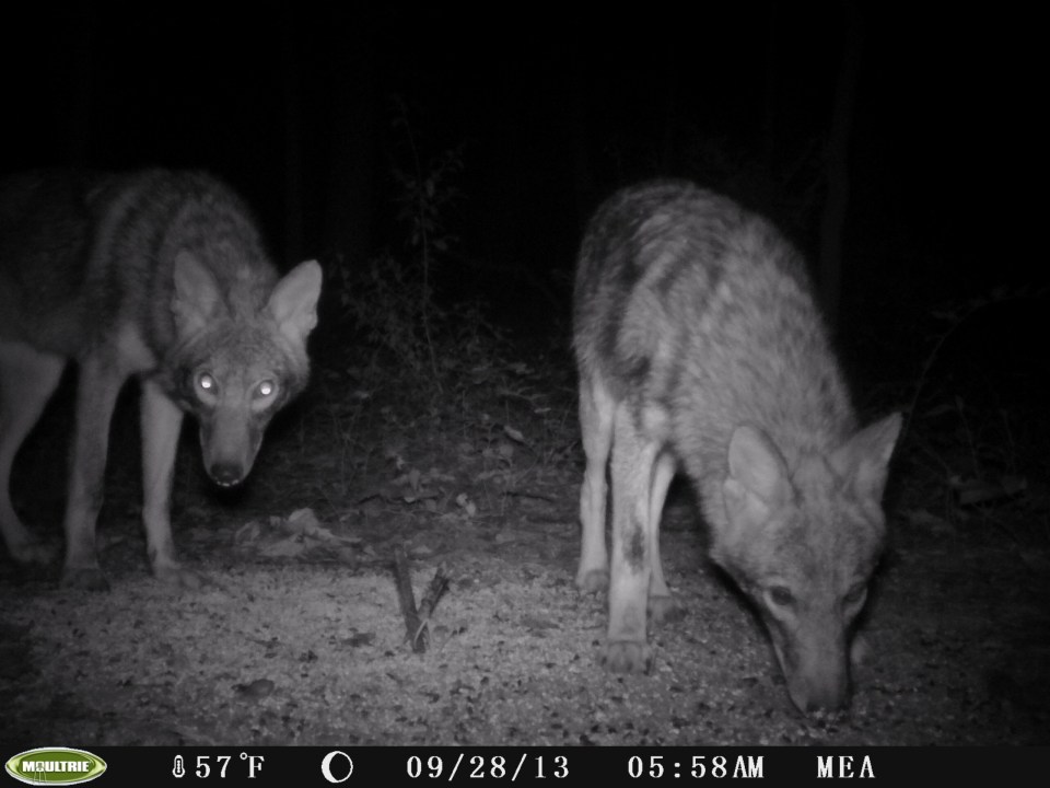 A pair of coyotes search for food at Ellanor C. Lawrence Park.