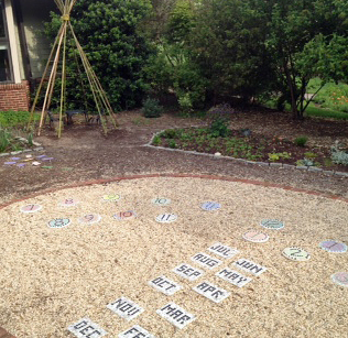 At Green Spring Gardens, the Master Gardeners, with help from Boy Scout Troop 1128 of Vienna, have created a garden for children that celebrates time and the sun. In the center of the garden is an interactive sun clock. It’s made of cement stepping stones with numbers outlined in mosaics and tiled stones that represent the months of the year.