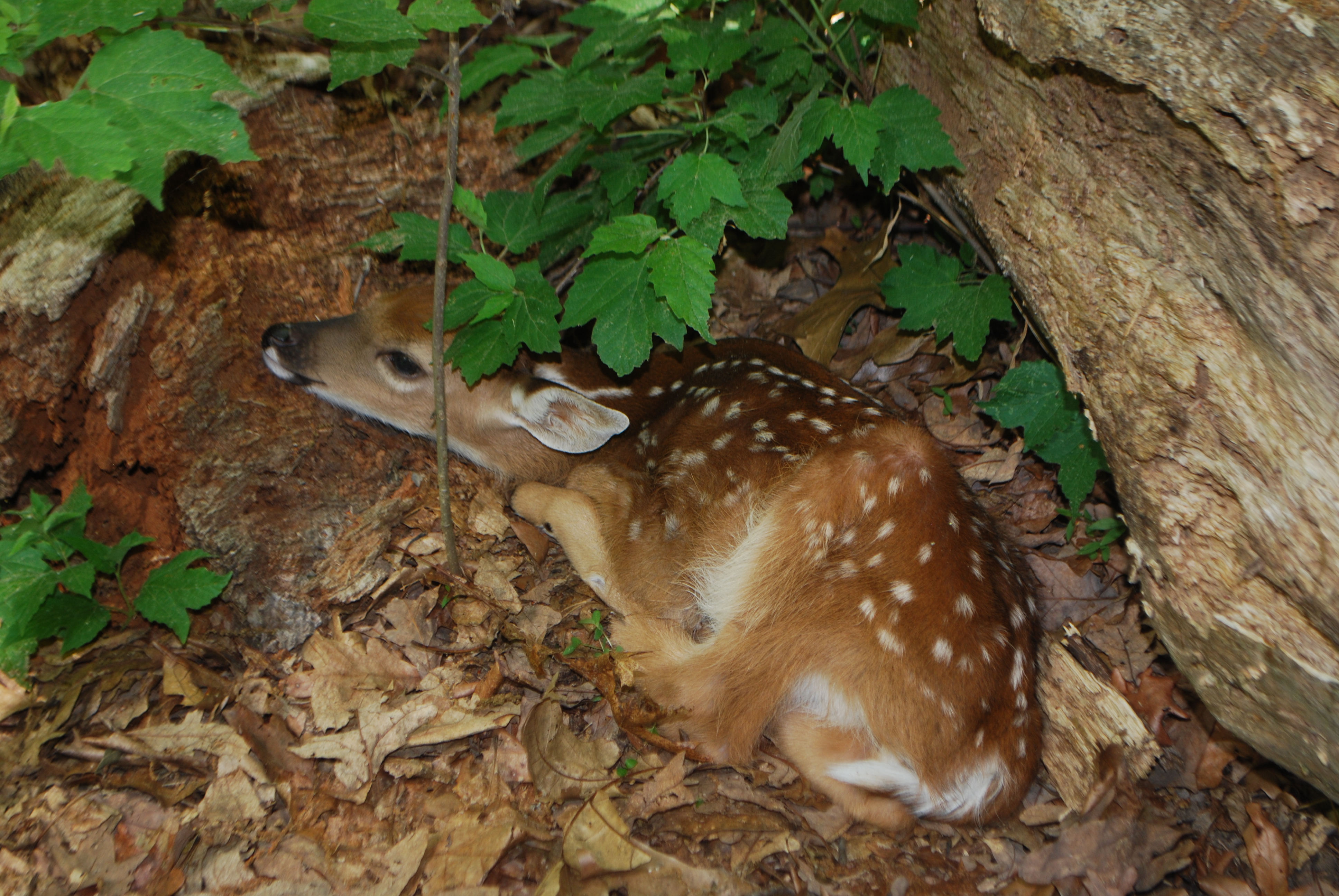 A child attending a birthday party at Hidden Oaks Nature Center discovered this camouflaged fawn hiding under a fallen tree.