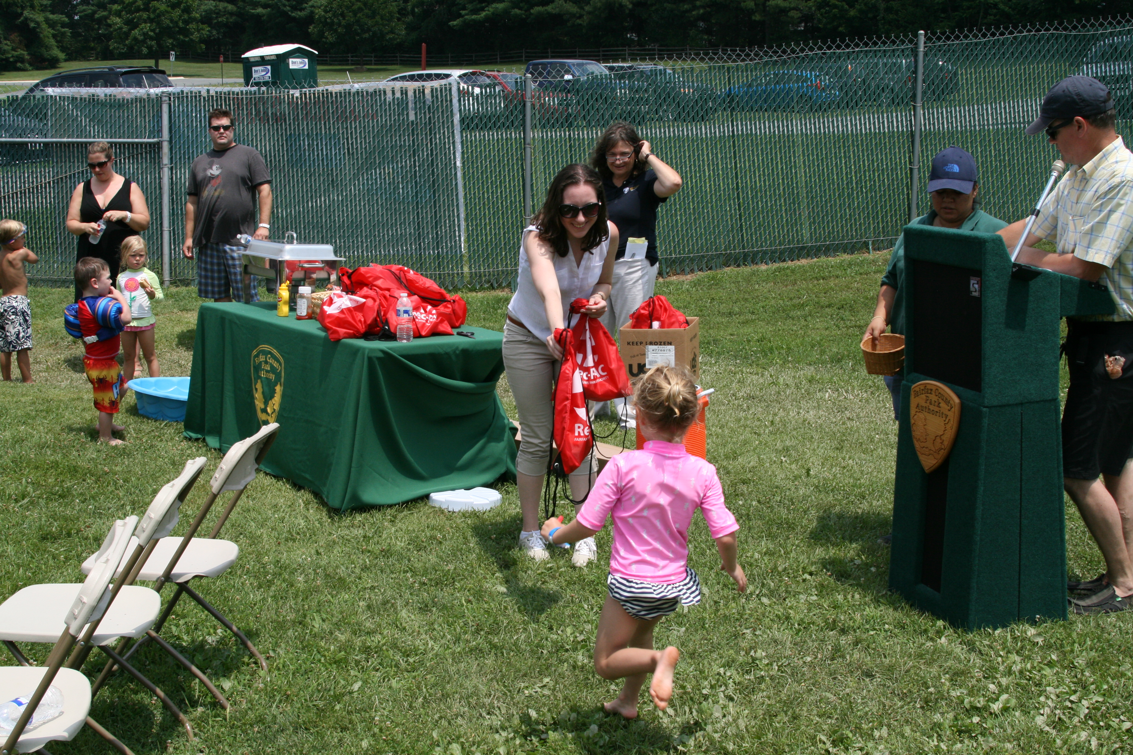 Summer intern Kathryn Wagner hands out goodie bags during a public event to celebrate the start of the Water Mine expansion project at Lake Fairfax Park.