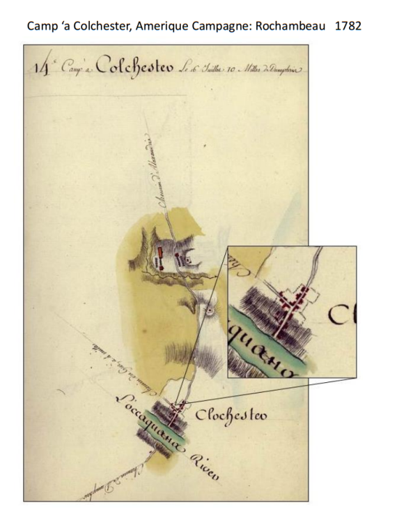 During the Revolutionary War, French General Jean Baptiste de Rochambeau passed through the area of Colchester in 1781 and 1782, crossing the Occoquan River and passing through the town of Colchester. His map notes the Occoquan River and Colchester along with a camp north of the town. The map contains no scale, but structures were noted along the intersection of Furnace Road and Old Colchester Road. The town of Colchester was well established by the last quarter of the 18th century, so the buildings could represent homes and other structures, which Rochambeau drew to mark the busy port town.