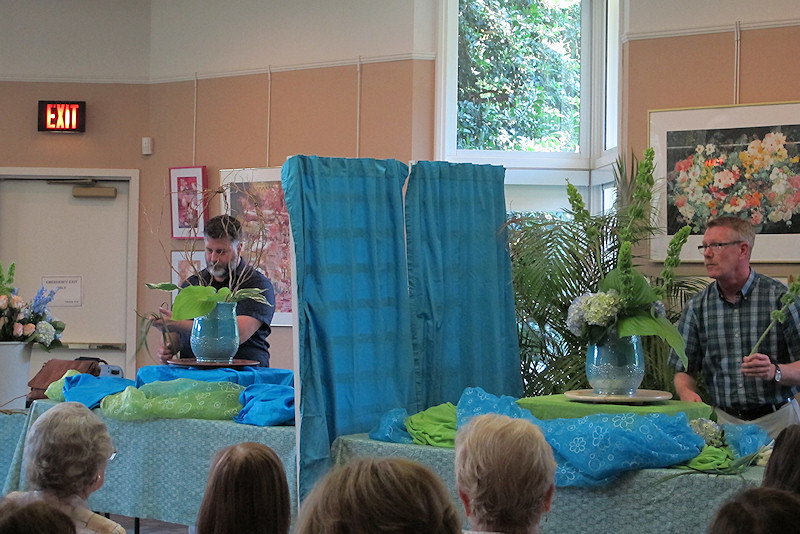 The audience delighted in the unfolding of the individual styles. Throughout the process the guests asked questions about the mechanics of floral design and the variety of events for which the two provide arrangements.
