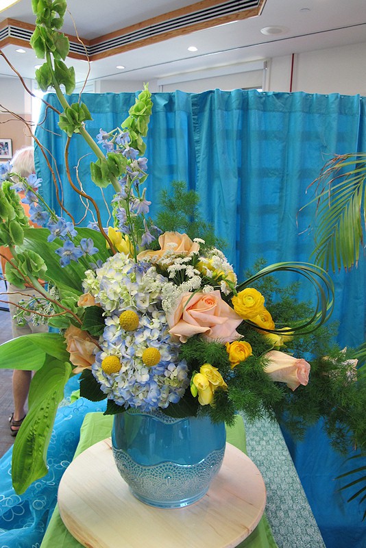Upon completing their work, both artists were invited to view the other’s design. Pippin’s design followed an ‘S’ shaped swoop, drawing the eye from curly willow at the top to a momentary rest on a flower cluster in the middle, ending with a fern-like spray of leaves and roses. Swann envisioned an open meadow of flowers with his arrangement, manifested by clusters of flowers suggesting the arrangement one might find in a garden. The curly willow provided height while hinting at transparency that allowed the viewer to gaze either at, or through, the arrangement.