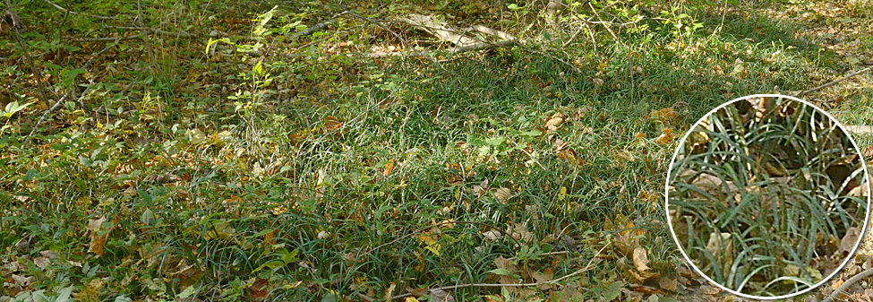 Throughout much of the year, creeping liriope displays narrow, dark green foliage, extending several inches to over a foot. By late summer, tiny purple flowers emerge, though they can occasionally be whitish. In autumn, small, black, ball-like fruits replace the flowers along the stalks. While some references state that wildlife may consume and scatter the seeds, water motion and foot traffic are the more frequent modes of dispersal. With few diseases or herbivores keeping it at bay, liriope root fragments and seeds start growing where they please. Since liriope is hardy and cheap, it is over-utilized in landscaping projects by both contractors and private residents, thereby furthering its coverage. Creeping liriope is a frequent find at plant swaps since people inevitably end up with more than they want. However, sharing an invasive weed is not friendly and neighborly. It is an affliction in landscapes and natural areas. Countless gardeners who thought creeping liriope would be a good, easily controlled addition to their plot ended up regretting planting it. What was supposed to be a low-maintenance plant proved to be too much work in corralling this weed.