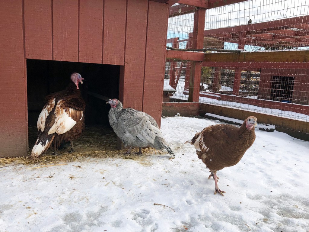 Other animals are not big fans of snow, and they would rather stay warm in their shelter, like the chickens. The pigs love to play with new straw in their sheds, and they sleep close together to stay warm.