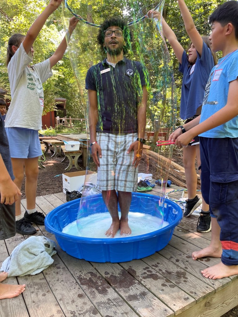 At a recent Hidden Oaks Nature Center camp, participants cooled off with water and bubble play. Naturalist Alex Doumbia found it cool, in multiple definitions of the word, to be encased in a bubble by the campers.