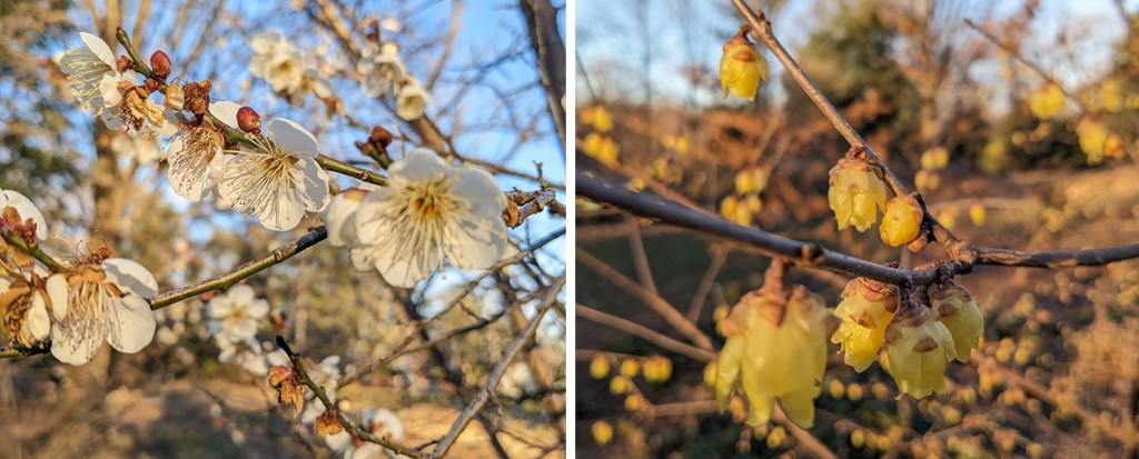 As you approach the Historic House, you’ll see the white flowering apricot tree, Prunus mume ‘Big Joe,’ with snow white blossoms. In nearby beds, lovely Helleborus hybridus in shades of cream and pink are beginning to open. If you notice a sweet fragrance, look for the small, waxy yellow blooms on the Chimonanthus praecox, or wintersweet. Its lovely yellow flowers emit a sweet fragrance that floats on the winter air.