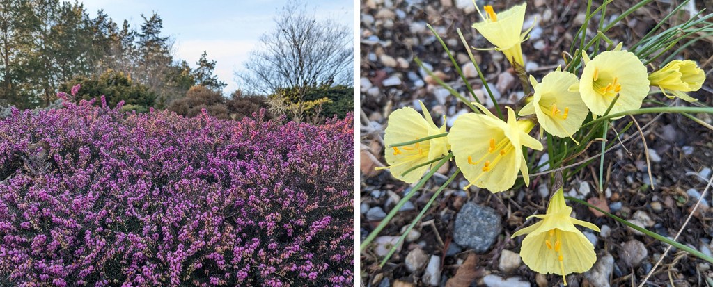 Head to the Rock Garden to see the swath of lovely pink blooms on Erica ‘Kramer’s Red.’ This winter-blooming heather provides color through the coldest months. Nestled at the base of the rock wall near the opuntia are two clumps of buttery-yellow daffodils, Narcissus bulbocodium. Also called hoop petticoat daffodils, their perianths resemble frilly petticoats.