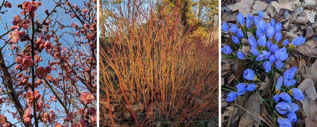 Follow the paved loop to the Arbor Garden where the flowering apricot tree, Prunus mume ‘Peggy Clark,’ brightens the garden with hundreds of clear pink blossoms. Then, head over to the colorful red twig dogwood (Cornus sanguinea ‘Midwinter Fire’) at the edge of the shrub border near the London Plane tree. If you look carefully, you’ll find a lovely clump of blue crocus coming into bloom. Near them, arching green stems are covered with lovely sunny blooms that resemble forsythia. This is Jasminum nudiflorum, and its starry yellow blooms, arrive weeks before forsythia.