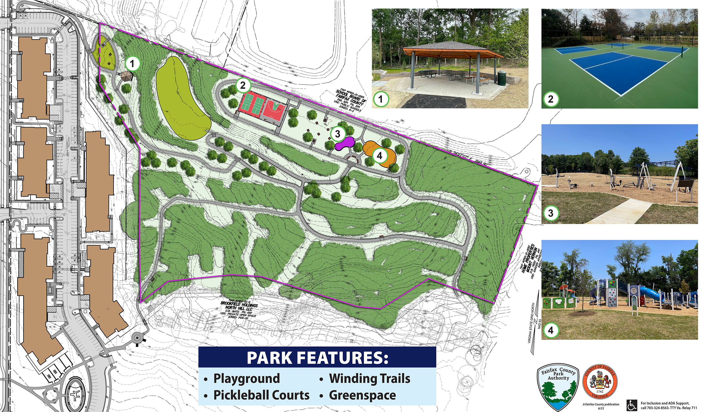 The development of North Hill Park also supports a major equity initiative in the Fairfax County Park Authority, the Parks, Recreation, Open Space and Access (PROSA) Strategy. PROSA is an innovative systems approach that provides a roadmap to improve walkable access to parks, provide various recreational experiences, enhance habitat connectivity and prioritize parks and recreation needs with an equity lens. A major component of PROSA is ensuring that Fairfax County residents have access to a park within a 10-minute walk from their residence. The creation of North Hill Park does just that. It’s placed among larger residential apartments and developments, and those residents now all have easy access to one of FCPA’s parks. This is a huge step towards expanding parks and recreational facilities in the community!