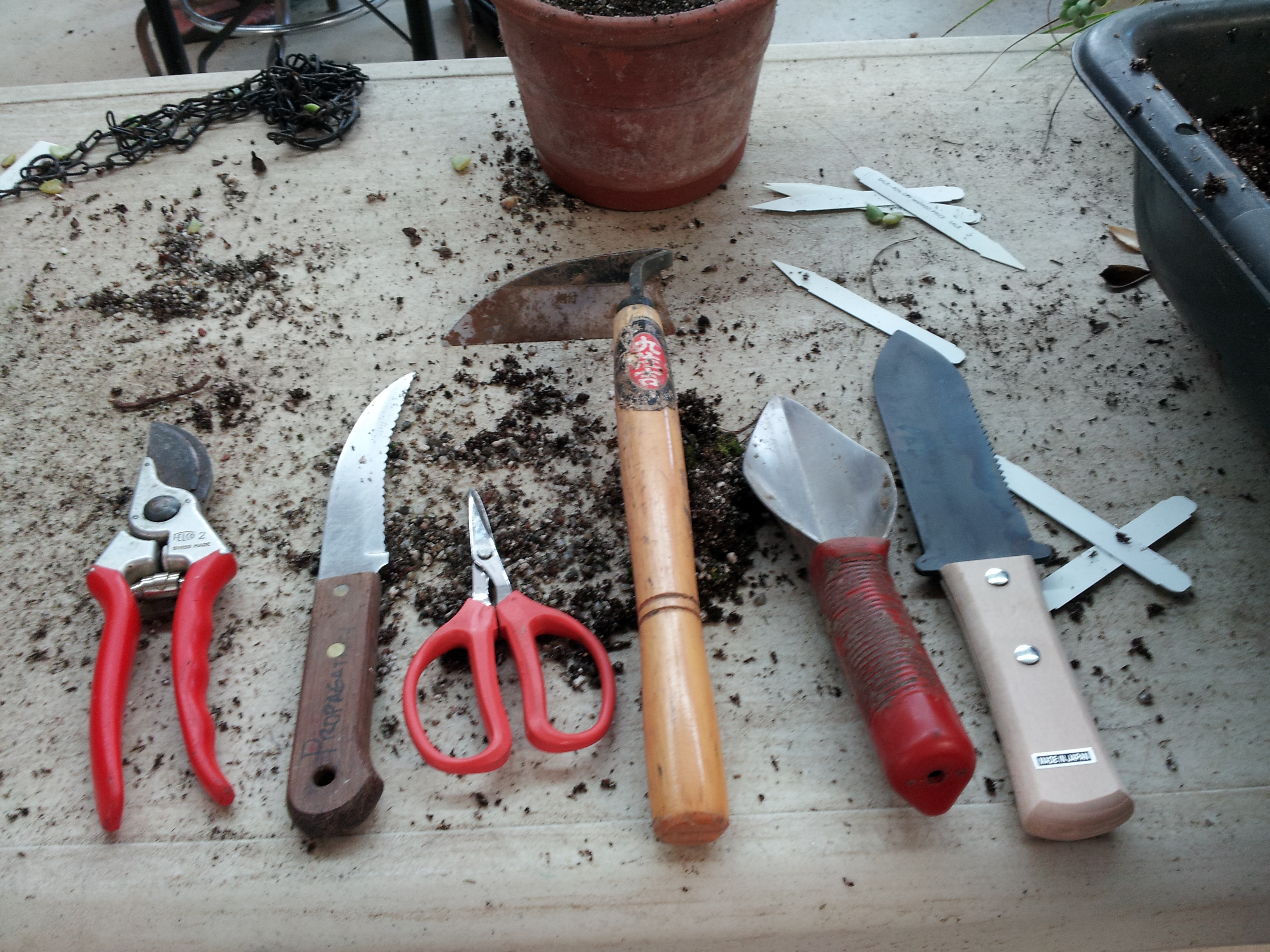 Propagation specialists Judy Zatsick and Mary Frogale both named the root knife as a multi-purpose tool of choice.  This knife has a serrated edge and curved tip and is designed to cut through root systems to divide plants. It is also great for opening containers. Along the same line as the fondue fork, gardener Carol Miranda carries chop sticks to sow seeds, mark plant locations and to stake small plants that flop over.  A little twine or a twist tie, and your plant is once again standing proud. My sister-in-law gave me a spool of cut-to-length twist tie that she purchased at a hardware store for just this sort of purpose.  Very useful.