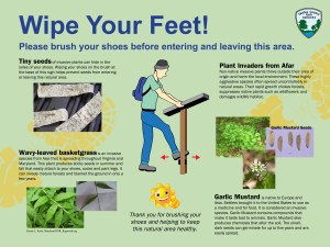 Most of us have learned over time to wipe our feet before entering the house. This spring, Natural Resource Specialist Kristen Sinclair will put a new spin on this message with the installation of three boot brush stations at Lake Fairfax Park. The goal of the one-year pilot project is to stop the spread of non-native invasive plant species such as wavyleaf basketgrass and garlic mustard by removing unwanted seeds from the soles of hikers’ shoes and boots.