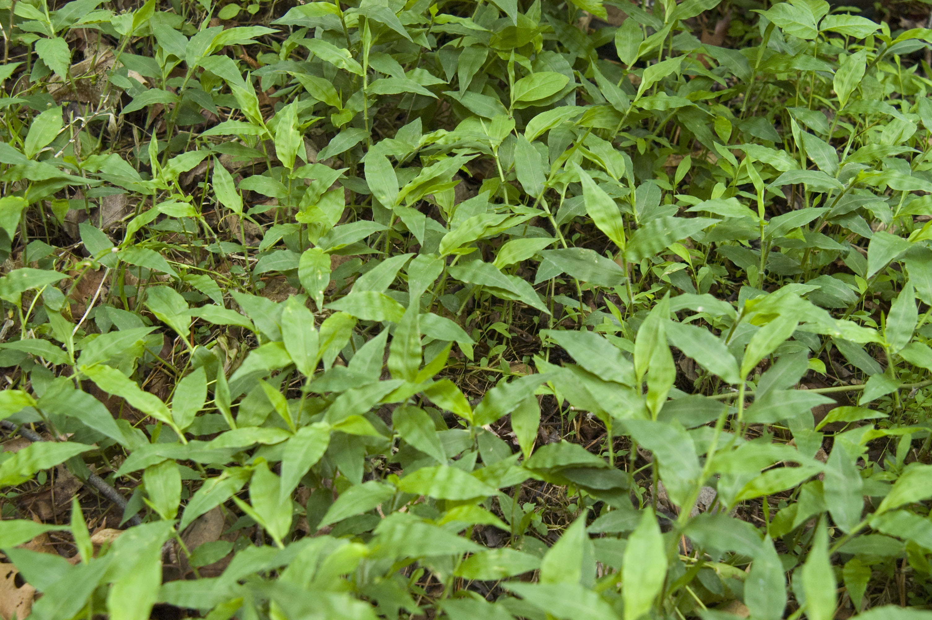 The threat of this happening at Lake Fairfax is very real. Erin Stockschlaeder, coordinator for the Invasive Management Area (IMA) and Early Detection and Rapid Response (EDRR) programs, has discovered and mapped wavyleaf basketgrass in the park. This plant blankets the forest floor, and its small, sticky seeds cling to pant legs, socks, and boots. As the invading plant spreads, native plants including deer’s tongue (a native grass), violets, trout lilies, and a variety of ferns disappear. According to Sinclair, one measure of success for the program would be finding no new populations of wavyleaf basketgrass in the campground or on the trails. If the program is deemed successful, brush stations may be installed at other parks throughout the system.